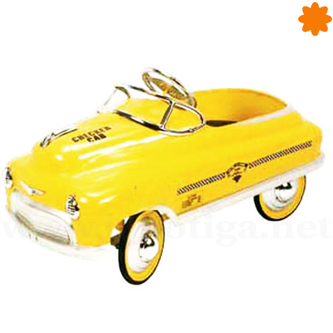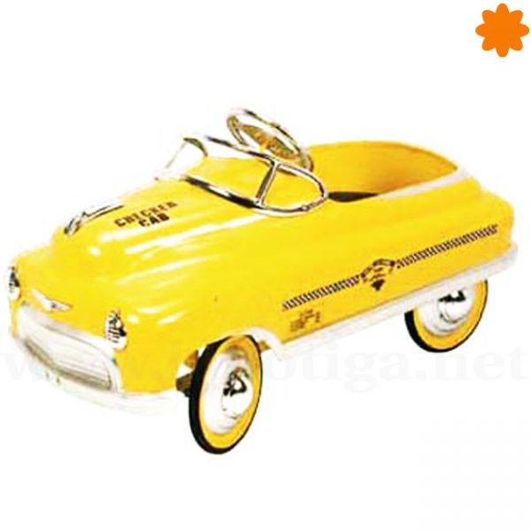 Original coche de pedales retro, qué es un taxi amarillo y negro.